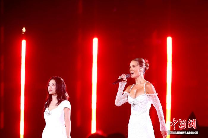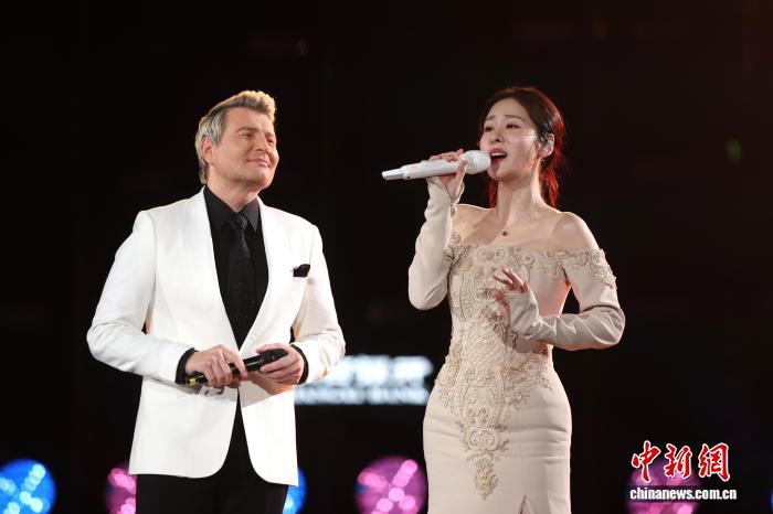 图为中原歌脚弛碧朝(左)取俄罗斯歌脚僧古推·巴斯科妇(左)连袂献唱《莫斯科郊野的夜晚》。中新社记者 刘占昆 摄