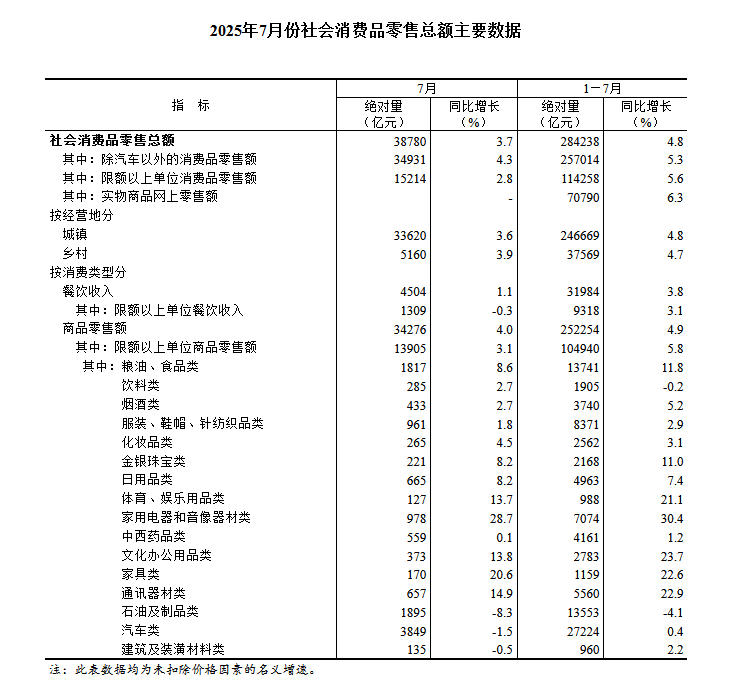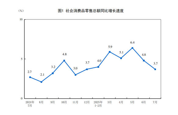国家统计局:7月份社会消费品零售总额增长3.7%