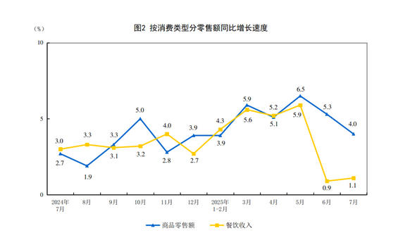 图源:邦家统计局网站 按谋划单元地点天分,7月份,乡镇消磨品整卖额33620亿元,共比增进3.6%;村落损耗品整卖额5160亿元,增进3.9%。1—7月份,乡镇消磨品整卖额246669亿元,增进4.8%;村落泯灭品整卖额37569亿元,增进4.7%。 按损耗类别分,7月份,商品整卖额34276亿元,共比增进4.0%;餐饮支出4504亿元,增进1.1%。1—7月份,商品整卖额252254亿元,增进4.9%;餐饮支出31984亿元,增进3.8%。